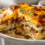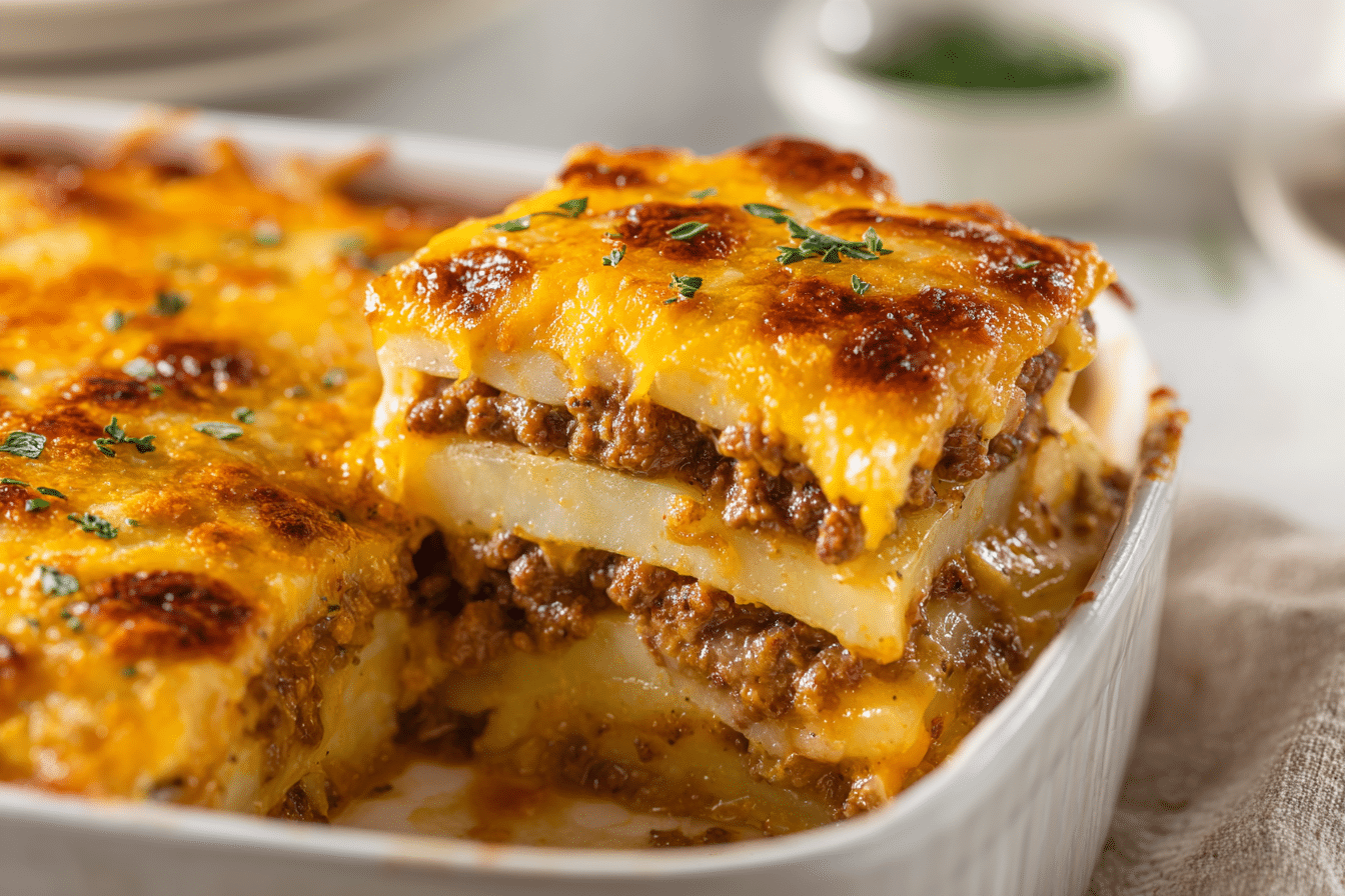 A layered casserole of seasoned ground beef, thinly sliced potatoes, creamy sauce, and melted cheddar baked until golden and tender.
