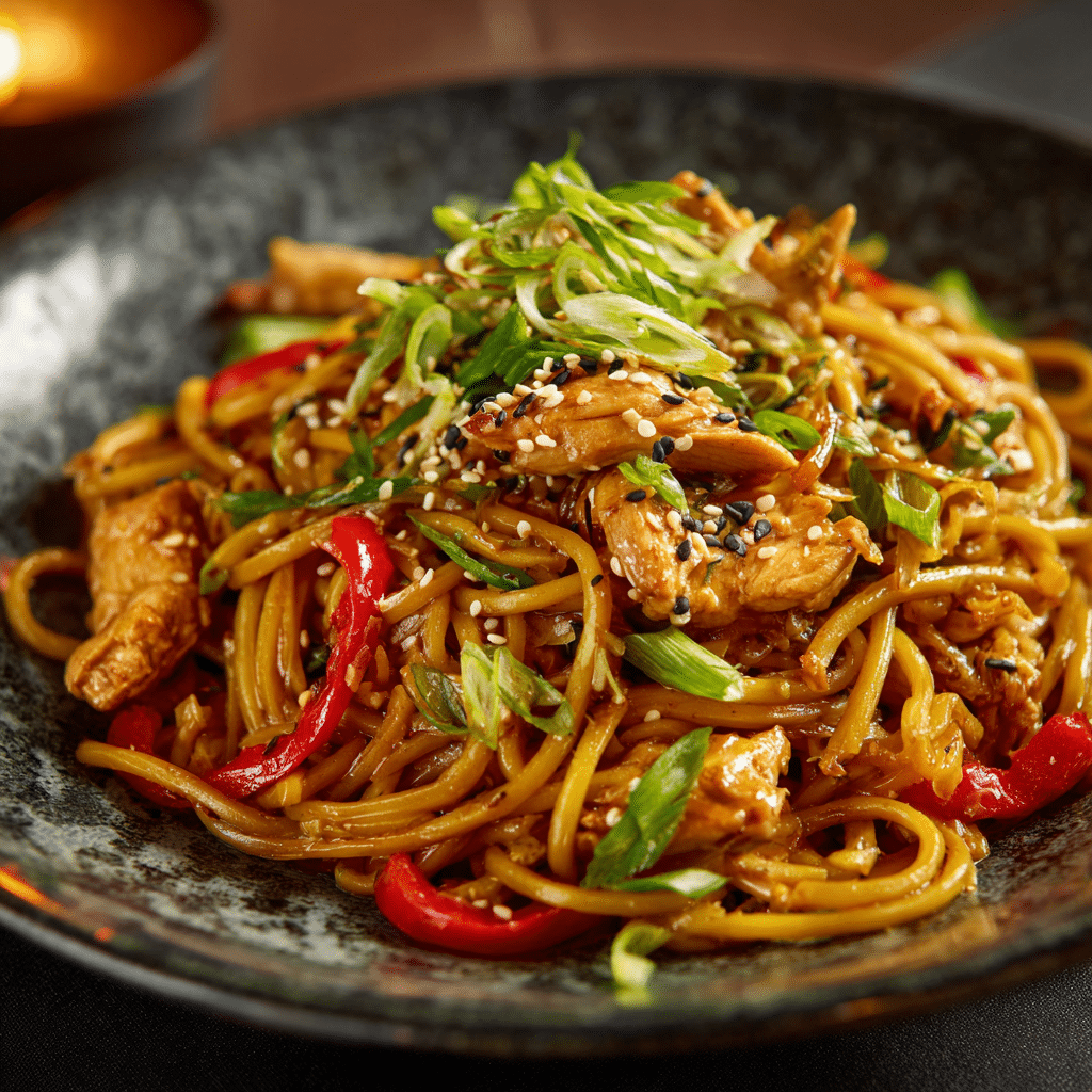 Return the chicken to the pan. Add the cooked noodles and pour in the prepared sauce. Toss everything together with tongs or chopsticks until evenly coated and heated through, about 2 minutes.