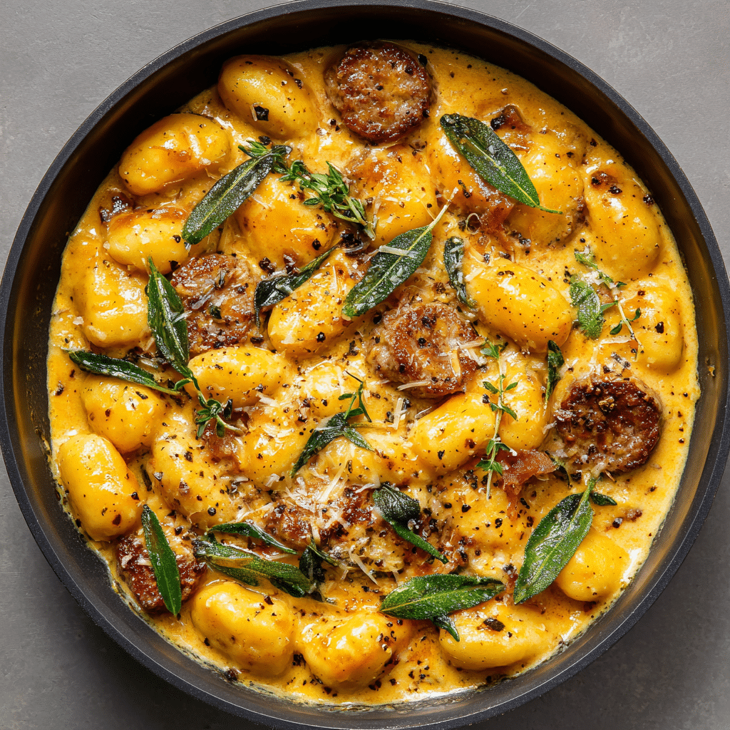 Creamy Butternut Squash Gnocchi with Sausage is the ultimate cozy comfort food — a dish that’s rich, creamy, slightly sweet, and full of savory depth. Tender potato gnocchi are tossed in a luscious butternut squash cream sauce infused with garlic, Parmesan, and herbs, then topped with golden, caramelized Italian sausage.