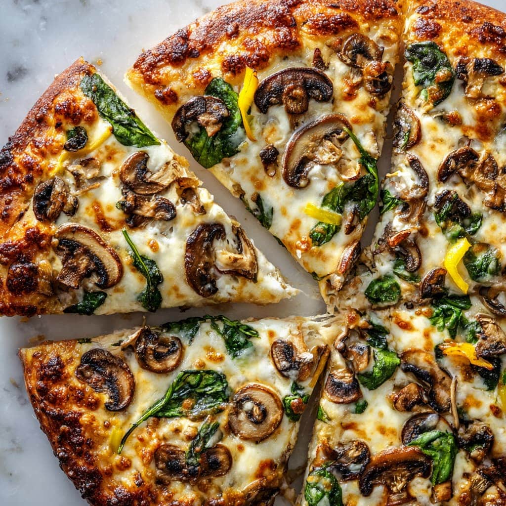 This pizza is a delightful twist on tradition. Instead of tangy marinara, it features a luxurious white sauce as the base, which pairs perfectly with earthy mushrooms, tender spinach, and the salty punch of olives. The combination creates a pizza that feels both gourmet and approachable, making it perfect for family dinners, cozy date nights, or even entertaining guests who appreciate something out of the ordinary.