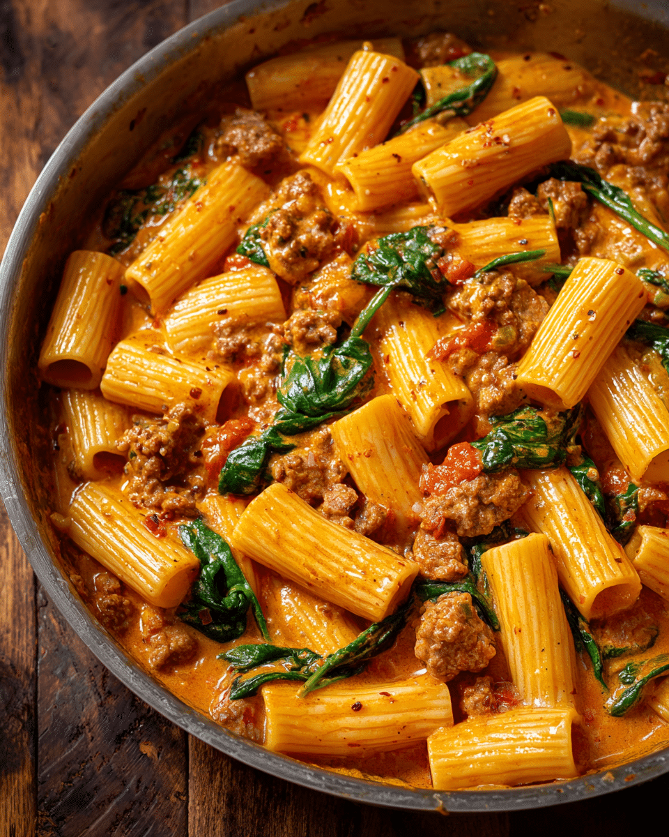 This Creamy Sausage Rigatoni with Spinach, Garlic, and Tomato Cream Sauce is a comforting, flavorful pasta dish that brings bold Italian-inspired flavors together in one ultra-satisfying skillet. Savory sausage, fresh garlic, and a touch of tomato paste create the rich base, while heavy cream and Parmesan transform it into a silky sauce that clings beautifully to rigatoni. A handful of baby spinach adds balance and freshness.