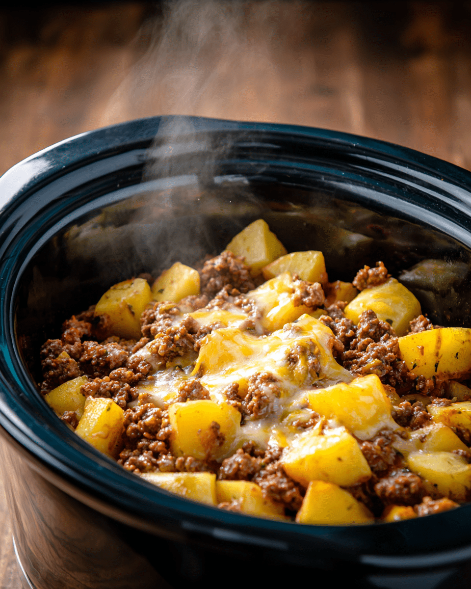 As it cooks low and slow, the potatoes become perfectly tender, the beef soaks up flavor from the sauce, and everything melts into a hearty, satisfying casserole that feels like old-school comfort food with modern convenience.