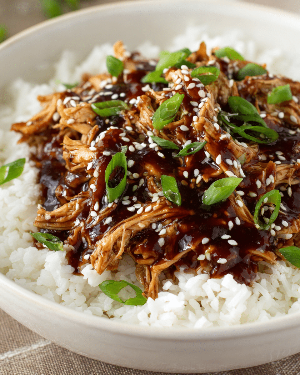 Shred the chicken using two forks directly in the slow cooker or remove and slice. Stir to coat evenly with sauce. Garnish with sesame seeds and chopped green onions if desired.