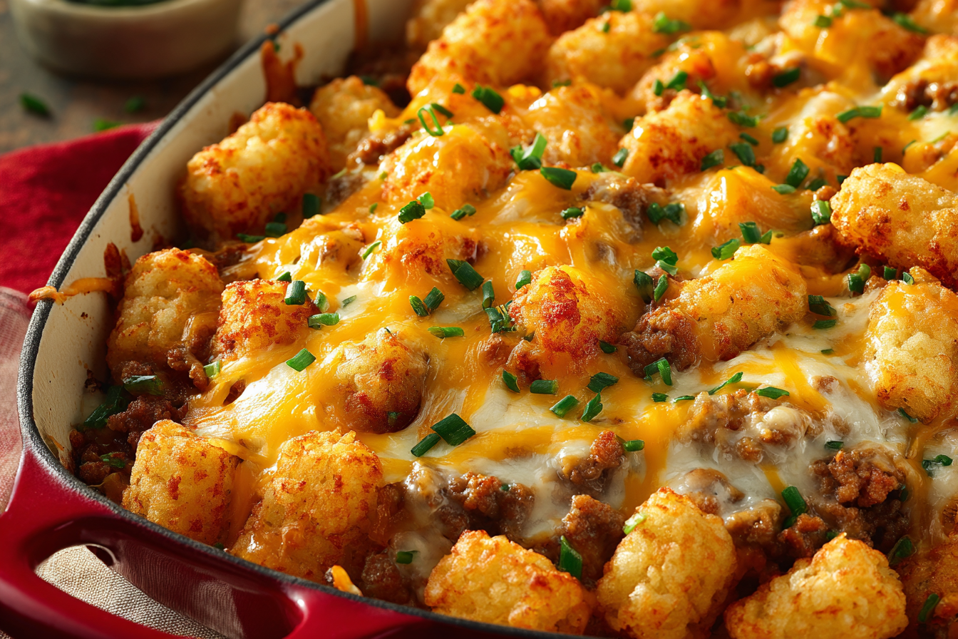 Frozen tater tots form the signature topping. As they bake, they turn golden and crisp, adding structure and texture to the casserole.