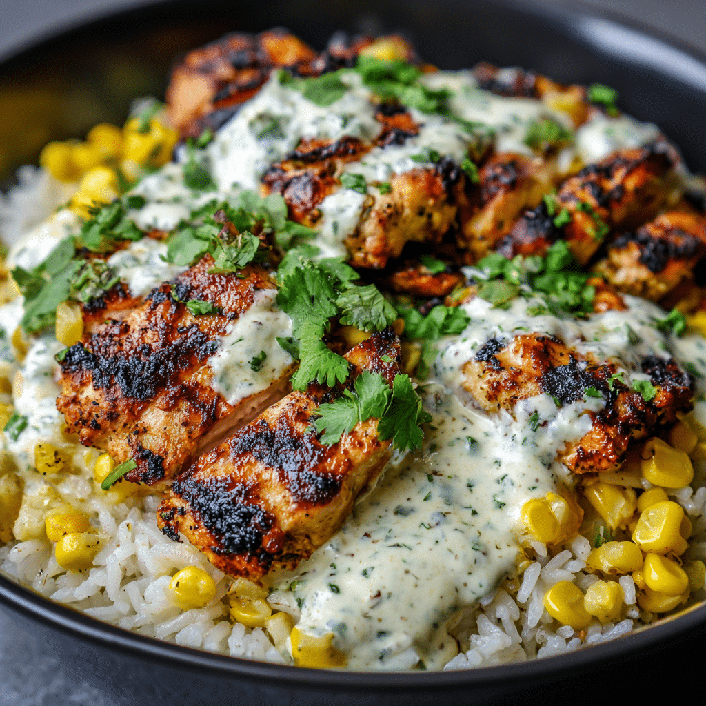 A fresh and zesty rice bowl featuring grilled chicken, charred street corn in a creamy chili-lime sauce, and fluffy rice. Inspired by Mexican elote, it’s perfect for meal prep or quick weeknight dinners.