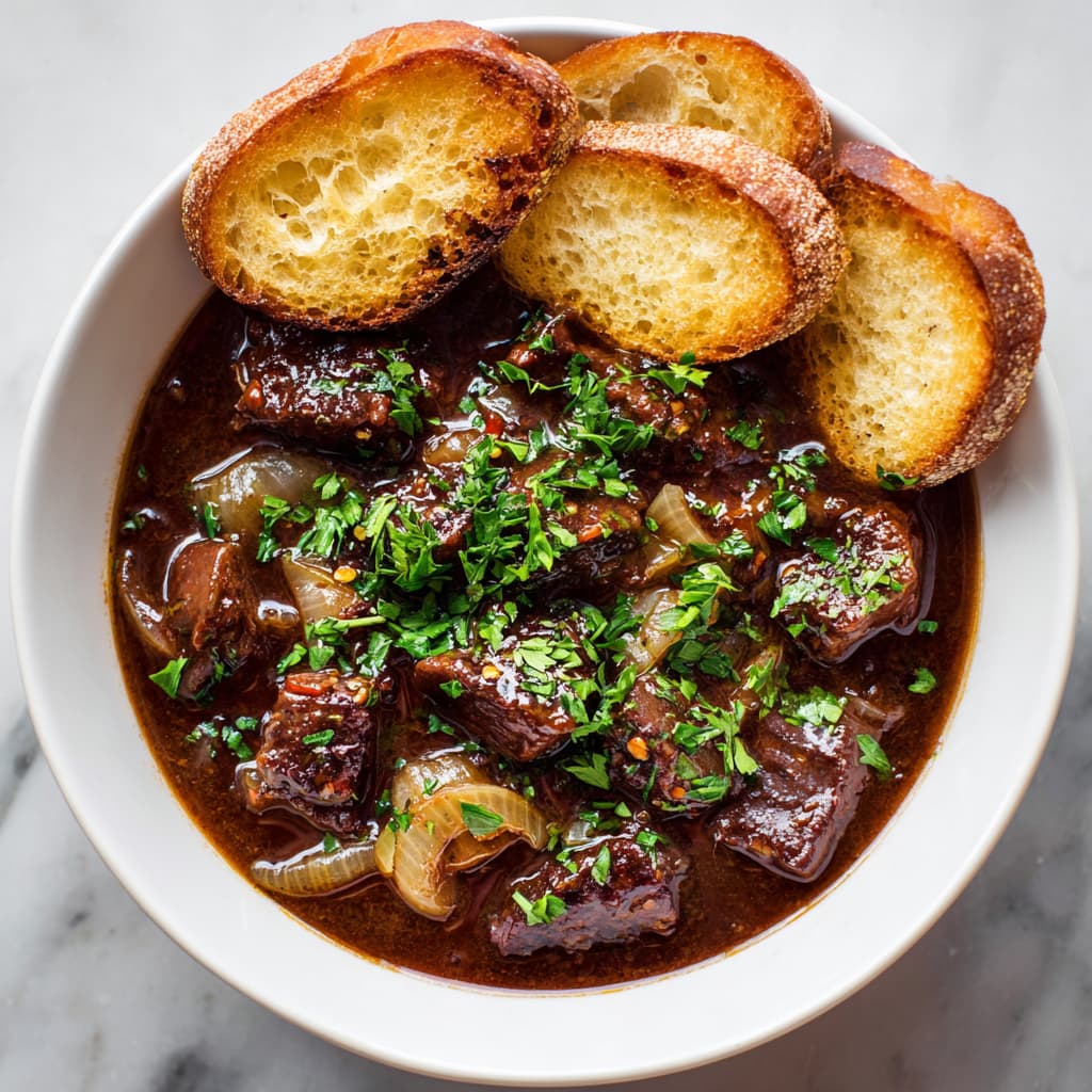 This dish is inspired by the French bistro staple but made heartier with slow-cooked beef. The result is a meal in itself — rustic enough for cozy winter nights yet impressive enough to serve at a dinner party. The slow braise of beef short ribs creates a broth that’s velvety and deeply flavored, while the caramelized onions bring a natural sweetness that balances everything out.