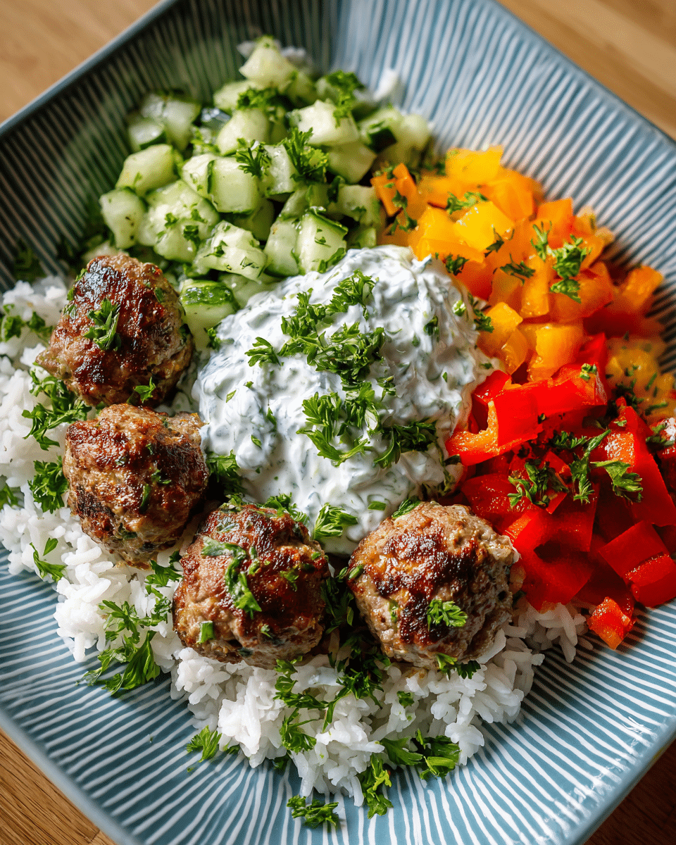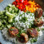 In this bowl, we marry those juicy, seasoned meatballs with a base of couscous, quinoa, or rice and layer in fresh cucumbers, cherry tomatoes, pickled onions, olives, and a generous dollop of creamy tzatziki. It’s a dish that tells a story through aroma and texture: garlicky meat, cool yogurt, crisp veggies, and warm, spiced grains come together in every bite.