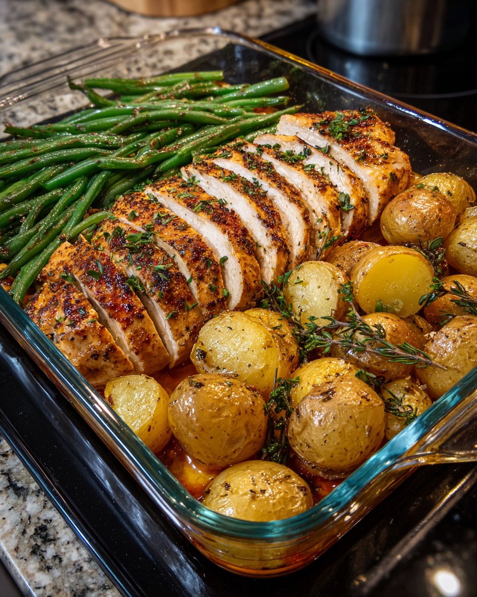 If you’re searching for a meal that’s wholesome, flavorful, and effortlessly elegant, look no further than Oven-Roasted Herb Chicken with Crispy Potatoes & Green Beans. This all-in-one sheet pan dinner brings together golden, herb-infused chicken thighs, caramelized baby potatoes, and tender-crisp green beans—all roasted to perfection. It’s a go-to meal for weeknights, family dinners, or make-ahead lunches that reheat like a dream.