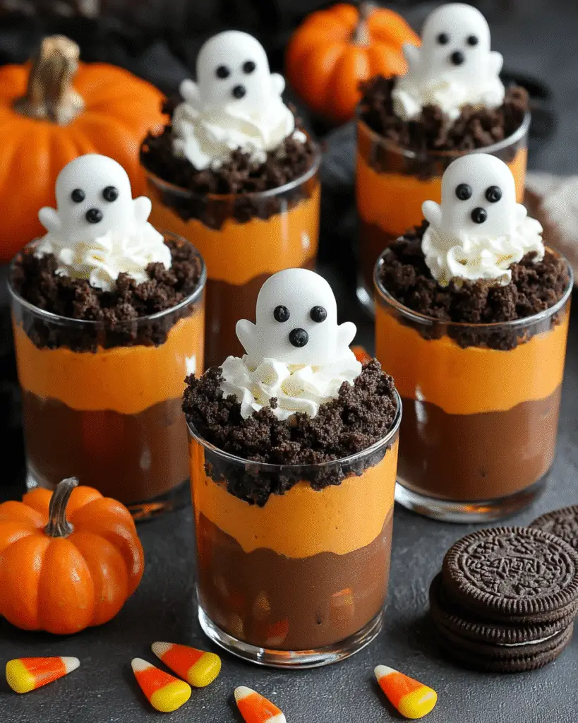 For extra presentation flair, place the cups on a tray sprinkled with cookie crumbs and mini pumpkins—it makes for a stunning Halloween dessert display.