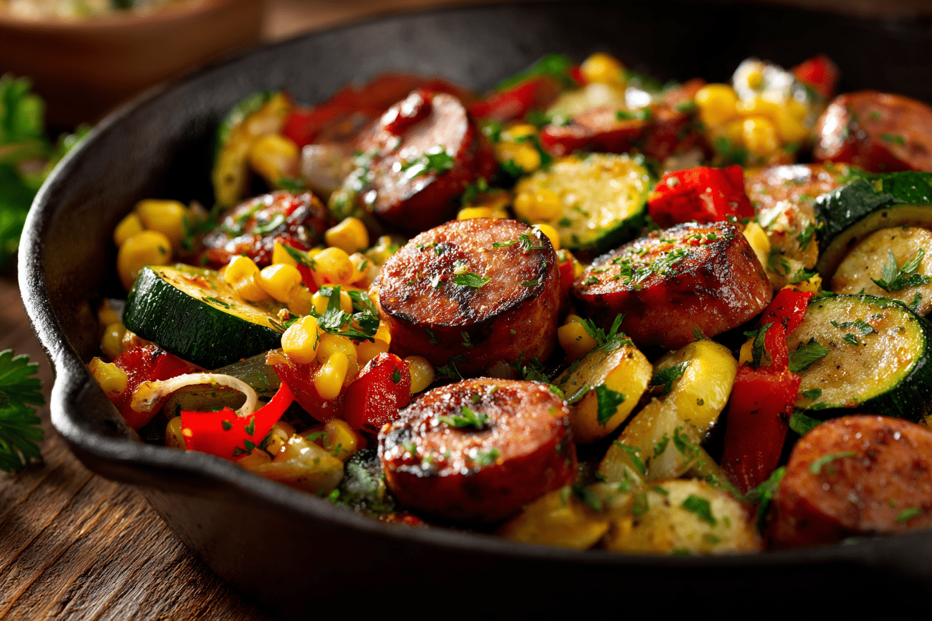 Return the cooked sausage to the skillet. Toss everything together and cook for another 2–3 minutes to allow the flavors to combine.
