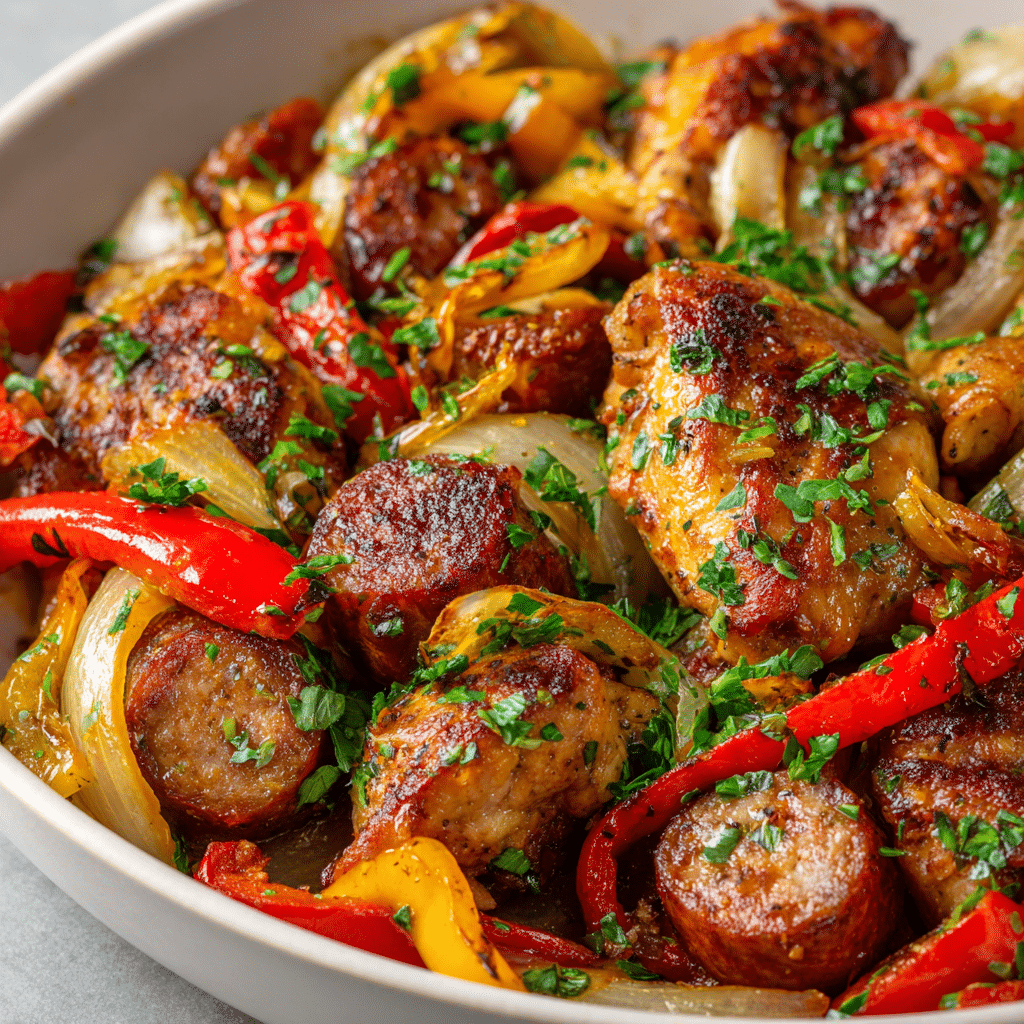 A savory Italian-American classic with juicy chicken, zesty sausage, and tangy peppers simmered in a rich vinegar-wine sauce. Perfect for weeknights or special occasions.