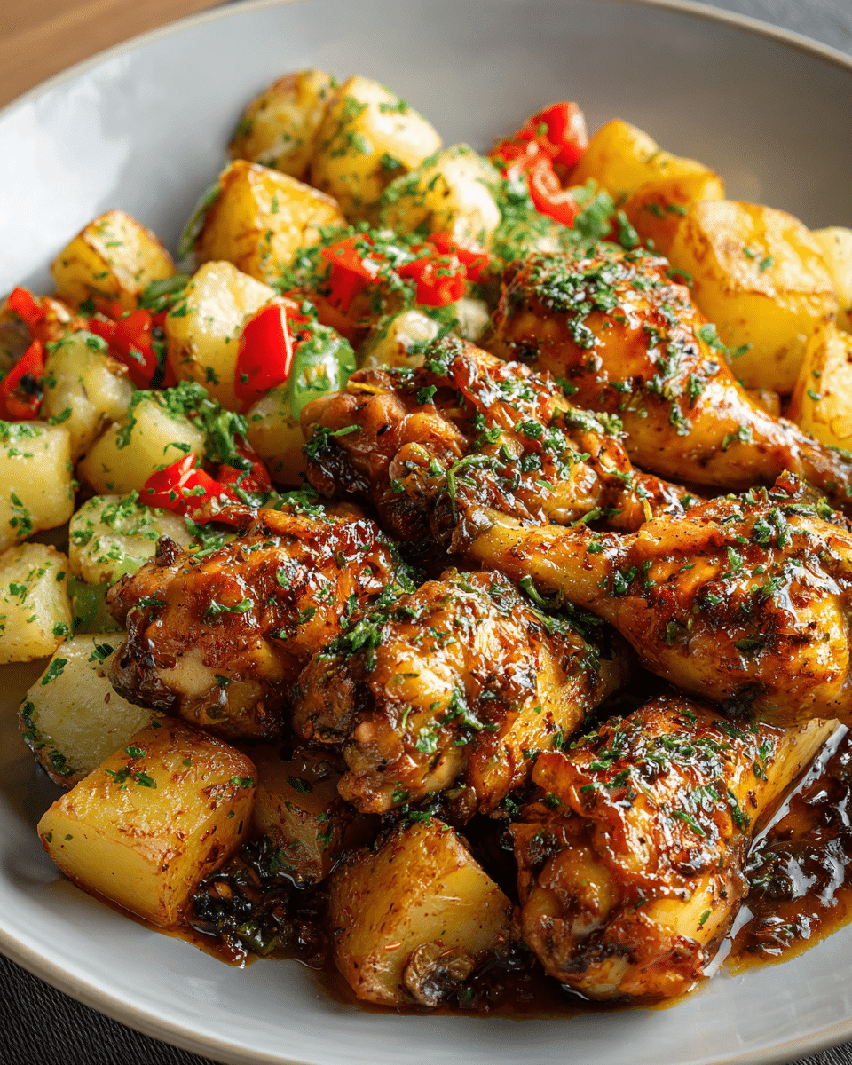 If you’re craving bold, saucy, and hearty all in one meal, these Sticky Glazed Chicken Drumsticks with Crispy Potatoes & Pepper-Onion Stir-Fry hit every mark. Tender, oven-roasted drumsticks coated in a sweet, tangy glaze are paired with golden-brown potatoes and a colorful stir-fry of peppers and onions for the ultimate balance of savory, sweet, and crunchy.