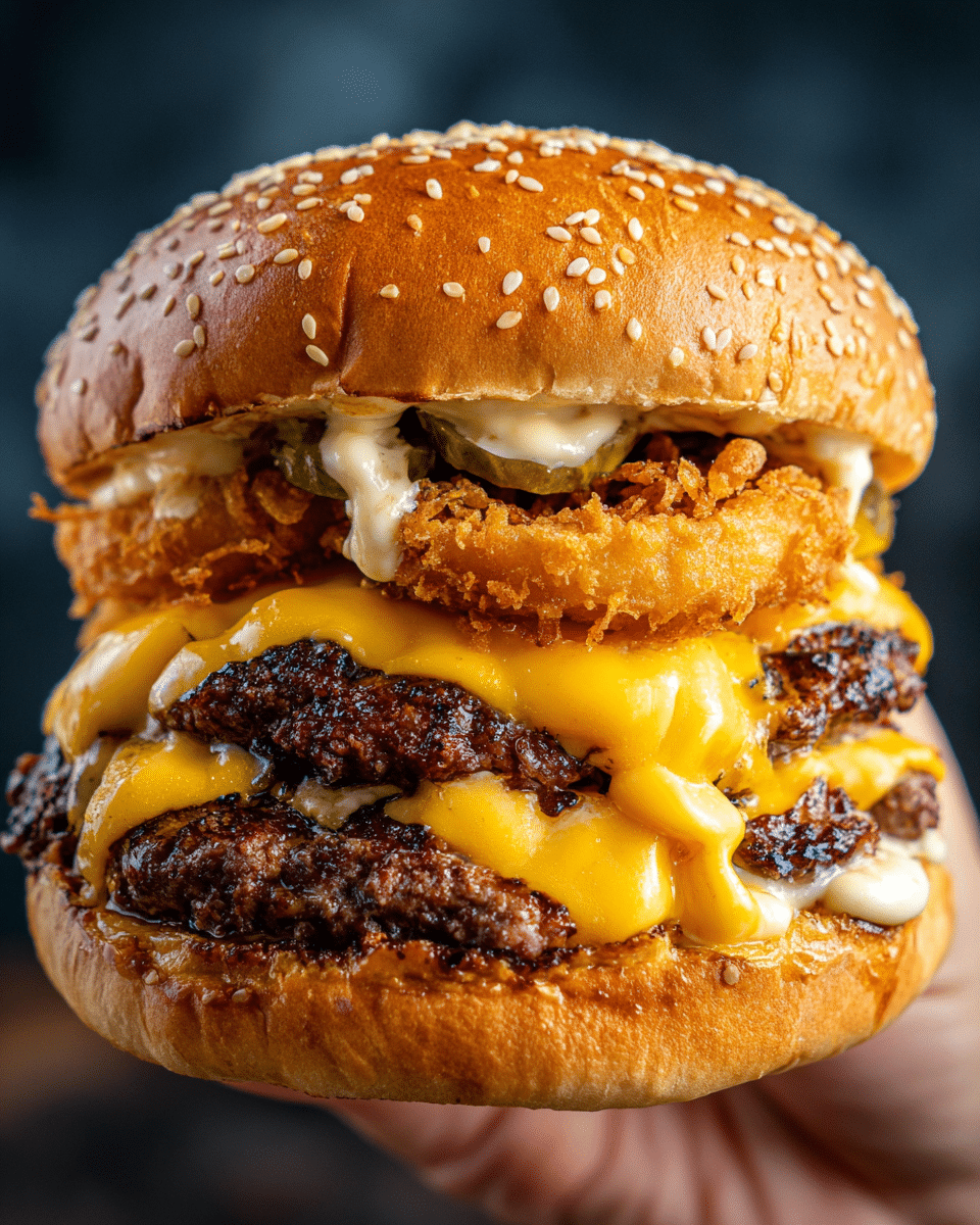 This Ultimate Double Cheeseburger with Fried Cheese & Secret Sauce is not just a burger—it’s a full-on flavor event. Two seared beef patties, layers of melty cheese, a crisp disc of pan-fried cheese, tangy pickles, and lettuce—all stacked high between toasted brioche buns and slathered with a bold, creamy “secret sauce.” Every bite is juicy, savory, crispy, and outrageously satisfying.